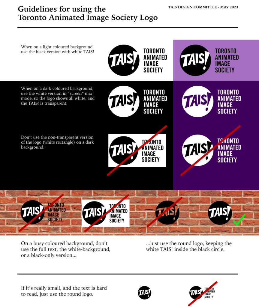 Please include the TAIS logo in your acknowledgements as shown in the Acknowledgement Guide. Where a logo is not appropriate, in it’s place community partners and TAIS-assisted animators may use text recognition such as “Produced with the support of the Toronto Animated Image Society” and link to our website at www.tais.ca